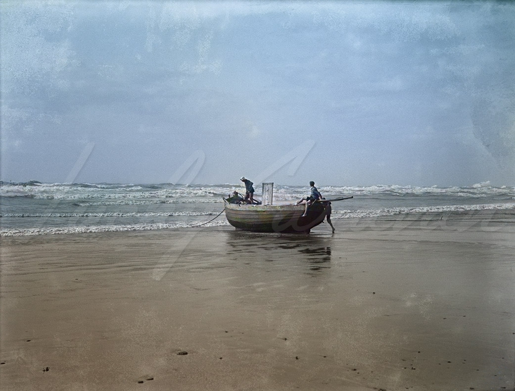 Launching of fishing boat in the English Channel near Boulogne, France, in the early 20th century.